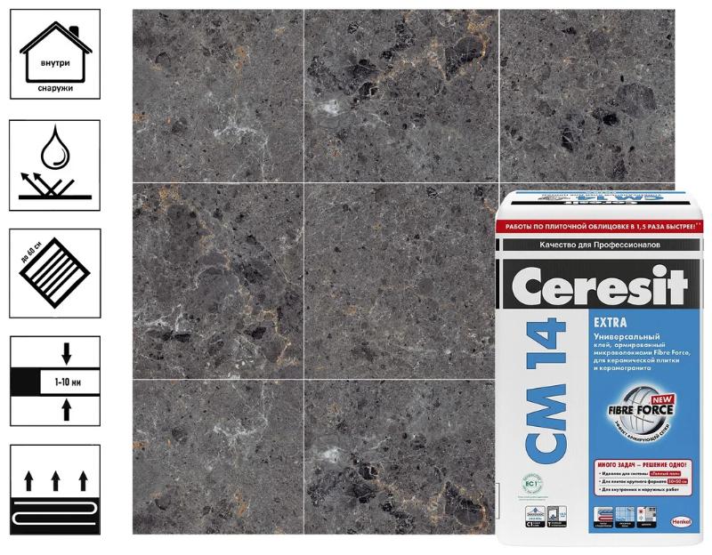 Клей CM 14 Extra предназначен для крепления всех видов керамических плиток, керамогранита, плиток из искусствен­ного (на цементной основе) и природного (кроме мрамора) камня размером до 50х50 см - на стенах и полах, внутри (включая влажные помещения и стяжки с подогревом) и сна­ружи зданий.Клей Ceresit CM 14 обладает высокими показателями характеристик, обеспечивающих высокое качество покрытия, а именно:
